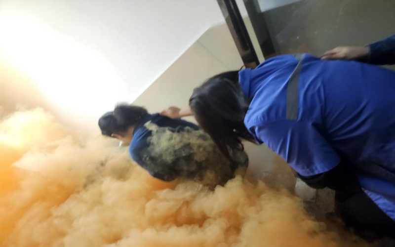 培训后,分公司开展消防逃生演练,在分公司二楼办公区域模拟真实的火灾现场,当浓烟四起,在教官的引导下,分公司员工冷静镇定,用湿毛巾捂住口鼻有序疏散至安全区域。通过此次逃生演练,职工们纷纷表示体验真实且收获巨大。