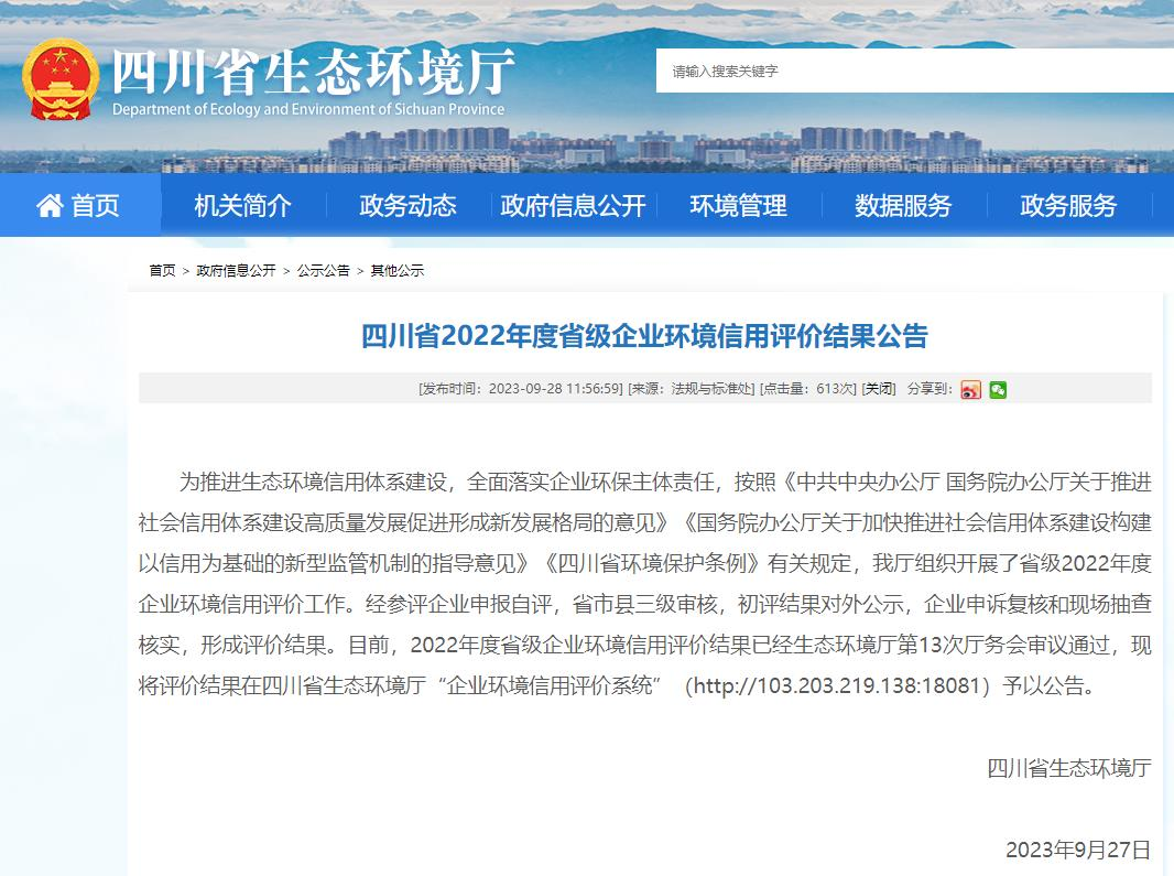 近日,达州市惠泉污水处理有限公司经过申报自评、省市县三级审核、对外公示、企业申诉复核和现场抽查核实等程序,在全省2972家、全市93家参评单位中,以101分的优秀成绩荣获四川省2022年度“环保诚信企业”称号。公司已连续两年荣获此殊荣。
