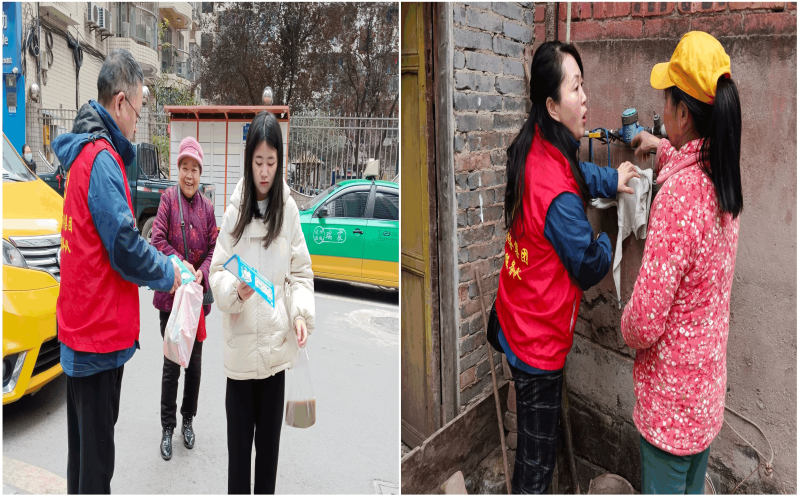 志愿者敲门入户向居民宣传水表、水管等供水设施的防冻保暖措施,提醒用户用棉麻织物或保温棉包裹室外水龙头、裸漏水管、水表等用水设施,提前做好水表的保暖防护工作。
