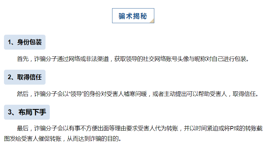 近期,“冒充领导、熟人等特定类身份”电信网络诈骗案高发,诈骗分子利用党政领导微信头像,以企业法人和单位下属为主要目标,主动添加微信好友,先假装关心企业发展或假意慰问下属来获取信任,然后以亲朋好友或者上级领导急需资金周转,自己不便直接转账为由来实施诈骗。