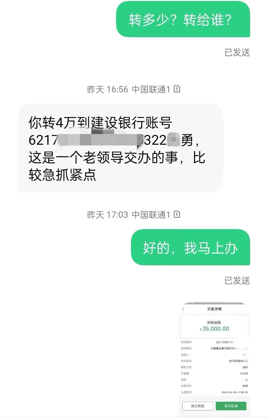 最终,在“领导”的不断催促下,张某向指定账户转账7万元,后因“领导”的钱迟迟未到账,才发现被骗。