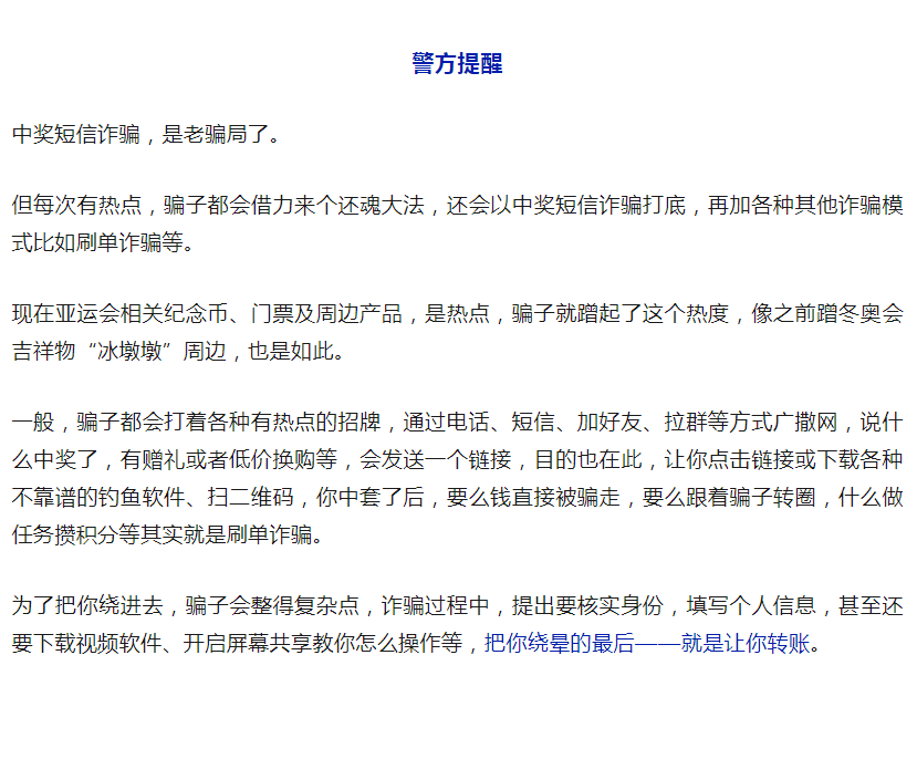 看到中奖短信,朱女士虽然很开心,但她没有急着去点短信上的链接,冷静下来一想,像这种亚运纪念币非常热门,身边很多朋友在网上预约购买都买不到,现在免费领取,还是全套,有这么好的事情吗?朱女士觉得自己可能遇到了骗子,报了警。