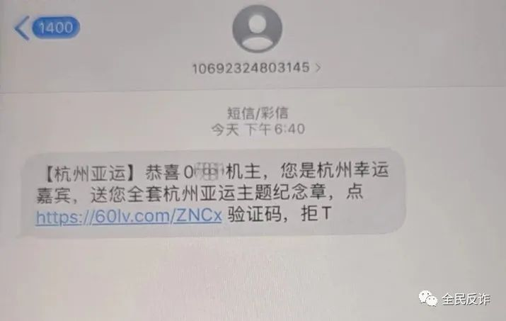 近日,朱女士回家路上,接到一个电话,对方那头传来温柔磁性的男声提醒她,说有一条短信记得查收,朱女士点开一看,短信显示:“【杭州亚运】恭喜****机主,您是杭州幸运嘉宾,送您全套杭州亚运主题纪念章,点http://60lv.com/ZNCx验证码,拒T ”。